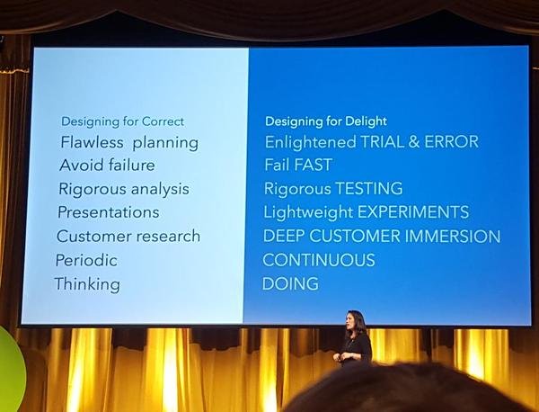 Suzanne Pellican of Intuit was the first to mention the C word, saying if you want to change the way your organisation works, and deliver the most delightful customer experience, you can’t afford to ignore organisational culture - see video.  Culture change is a long game - she described Intuit’s 8 year journey to change an organisation of 8,000 people to become a customer focused, design driven tech company.  Intuit changed from delivering a service via a CD Rom, which was sent out to customers infrequently to an online service - the culture had to move from designing for correctness to designing for delight - see the slide below.  Some of their lessons learnt are worth a mention.